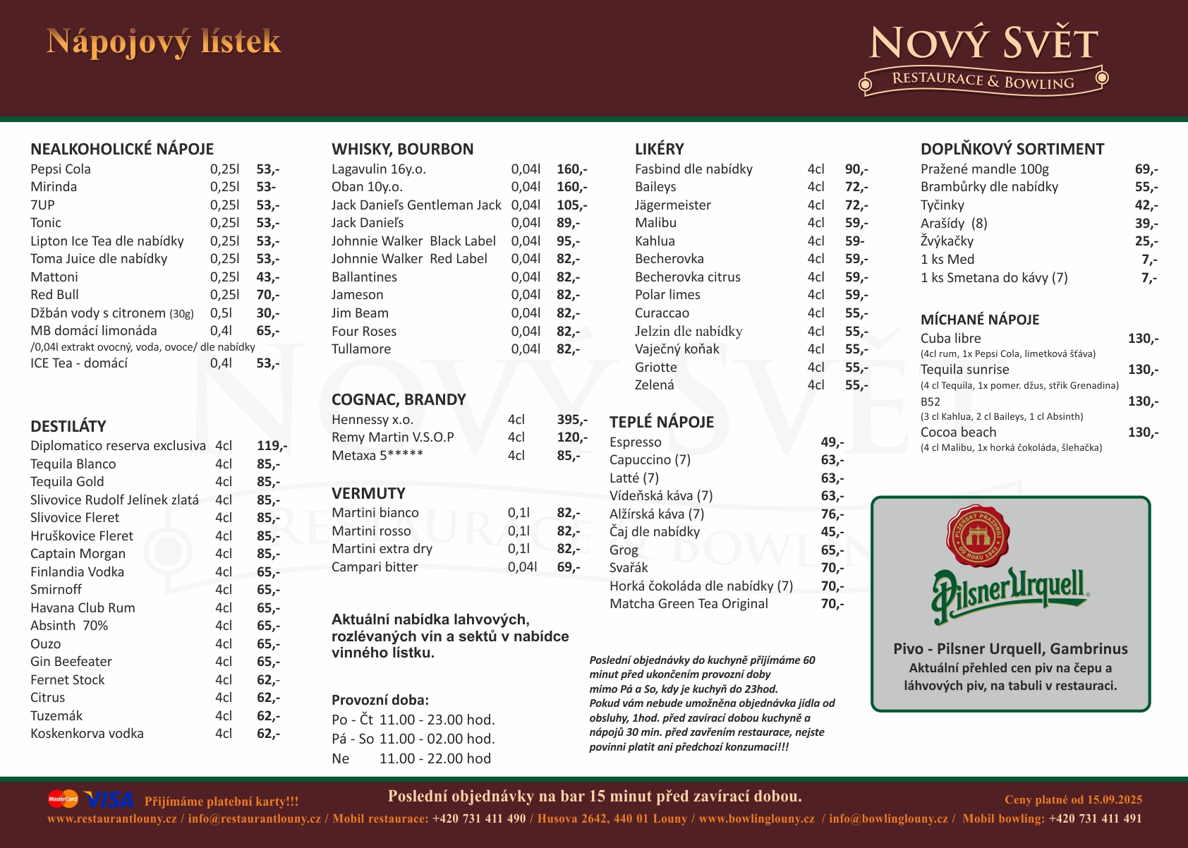 Pípy jsou naladěné na 6 druhů točeného piva. Krušovického Mušketýra i Ležák, z Holandska Heineken, kvasnicový Edelweiss a pro řidiče nealkoholický Clausthaller. Dubová vinotéka skrývá pravé skvosty nejen z malých moravských vinařství, ale i ze vzdálených krajin celého světa. Z ostřejšího alkoholu nabízíme whisky různých stáří a to dokonce i japonskou Yoichi single malt 10Y.o., jednu z nejkvalitnějších vodek světa Russian standard a mnoho dalších. Ve speciálním humidoru pro Vás skladujeme doutníky v ideální vlhkosti, tak abychom je udrželi v dokonalém stavu. Zapálit si u nás můžete i nejdelší běžně dodávaný doutník světa zapsaný v Guinesově knize rekordů.